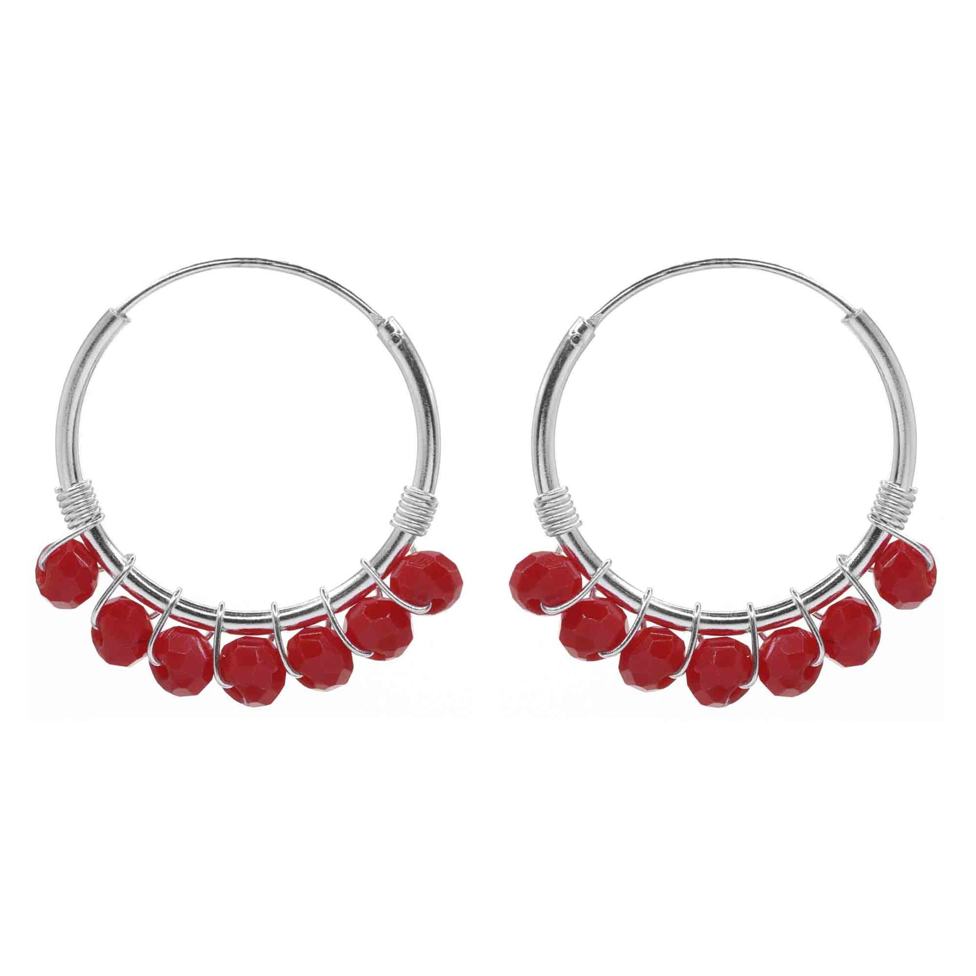 De plata 925 argollas con cristales rojos en diseño versátil y llamativo. Ideal para quiénes buscan algo distinto y fácil de combinar.