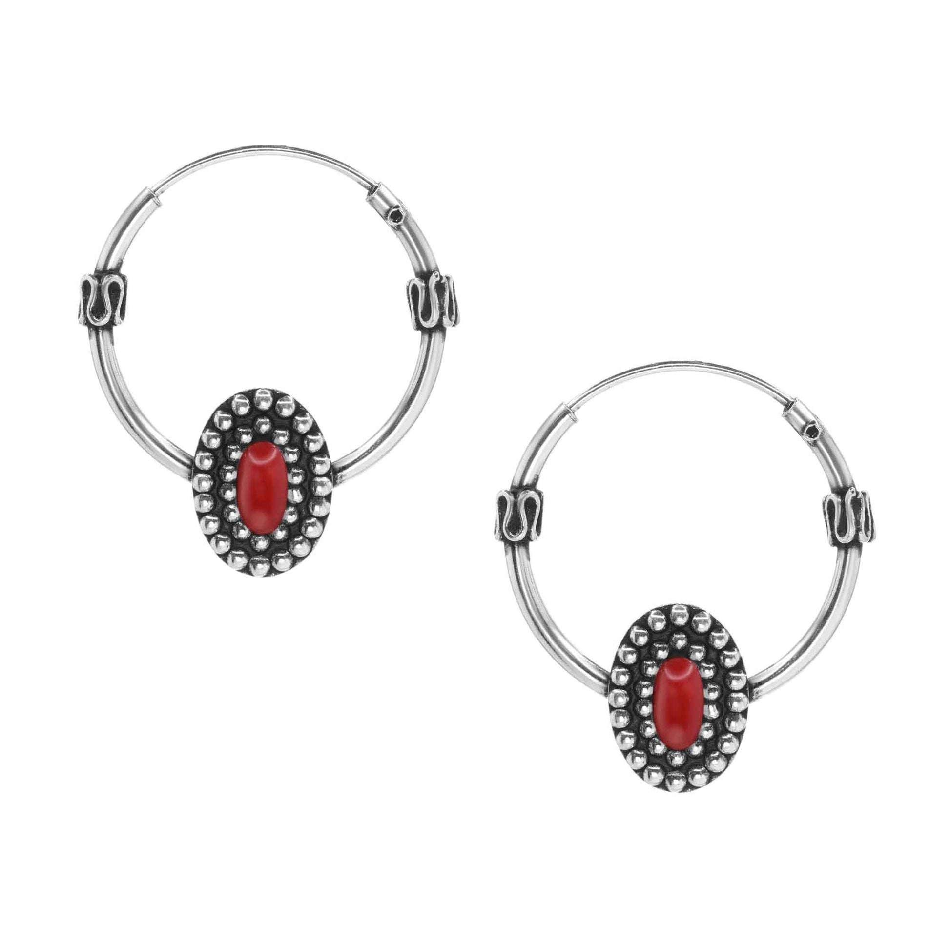 Aros de Plata 925 Argollas Diseño Tribal con Coral.