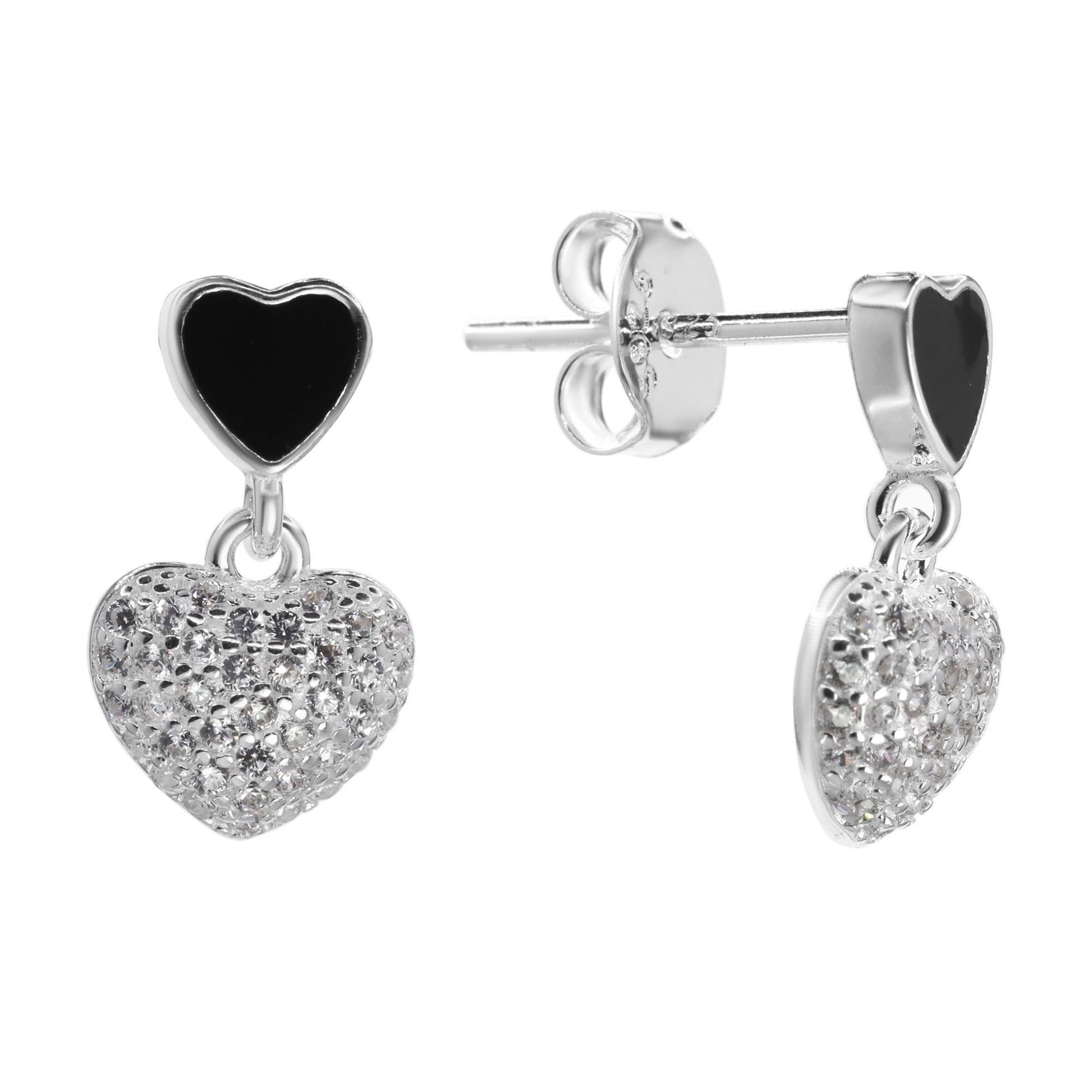 Aros de Plata 925 Corazón Esmaltado en Negro y Colgantes con Circón.