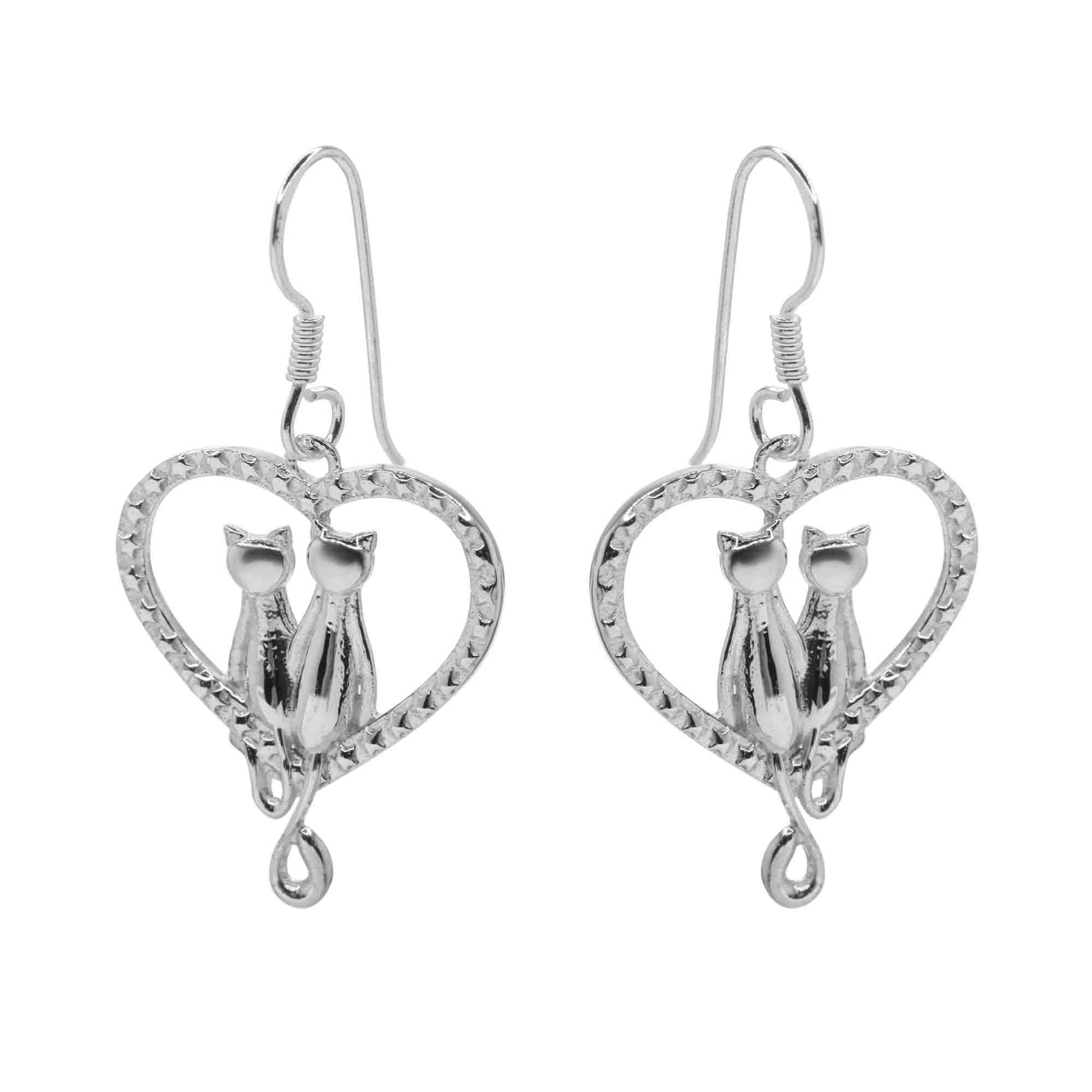 Aros de Plata 925 Diseño Corazón con Pareja de Gatos