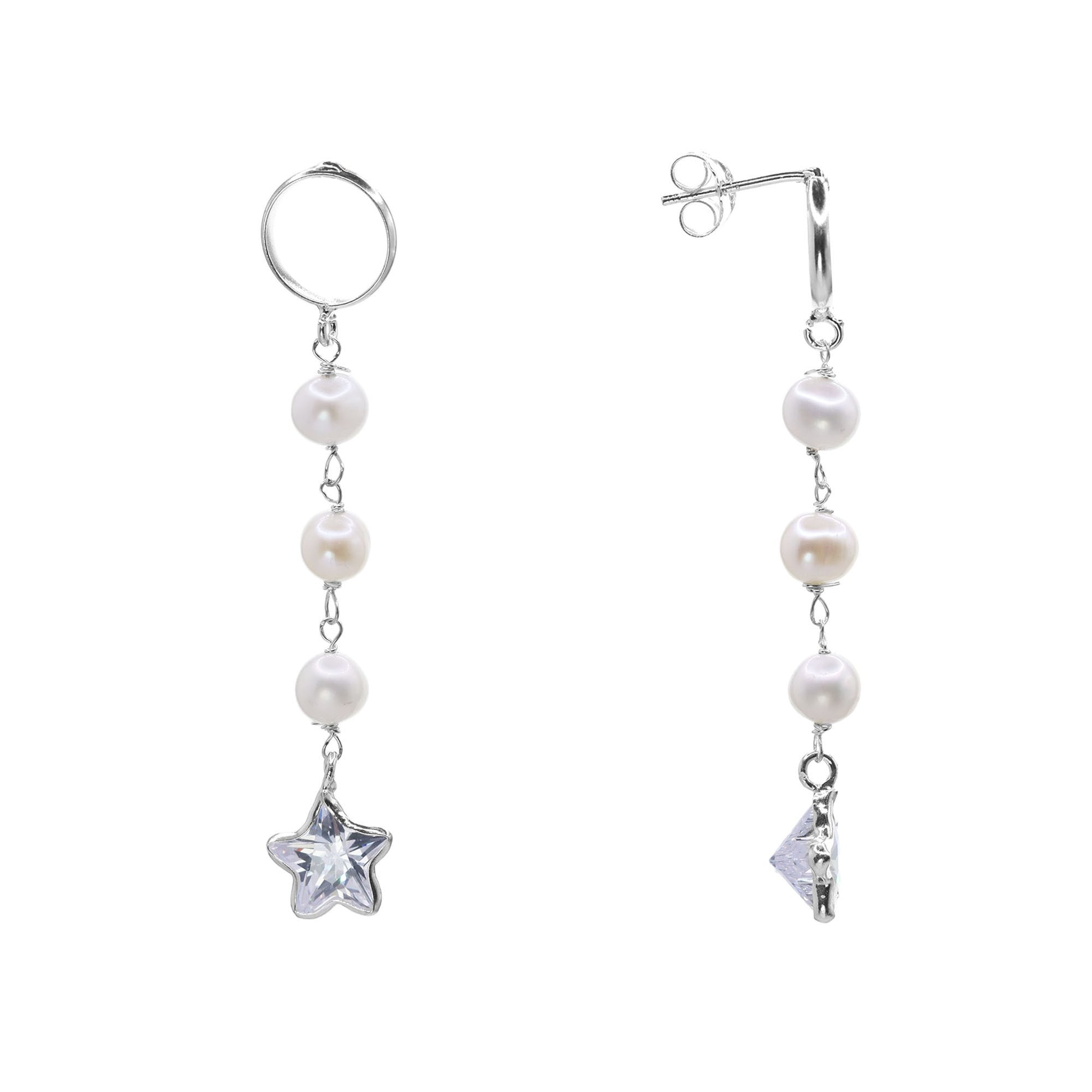 Aros de Plata 925 Estilo Argolla con Serie de Perlas y Estrella de Circón.
