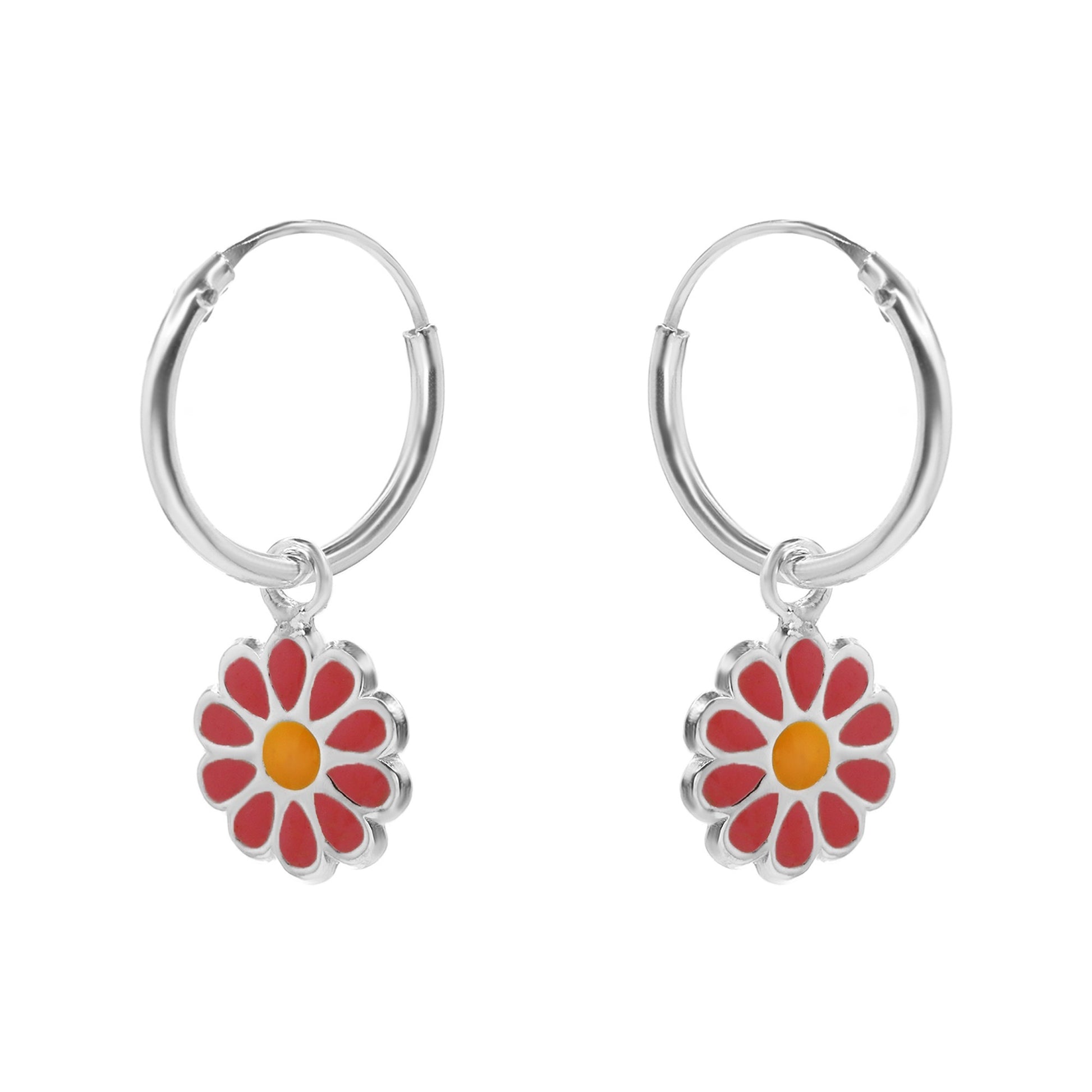 De plata 925 diseño argolla con margarita esmaltada rojo en diseño versátil y llamativo. Ideal para quiénes buscan algo distinto y fácil de combinar.