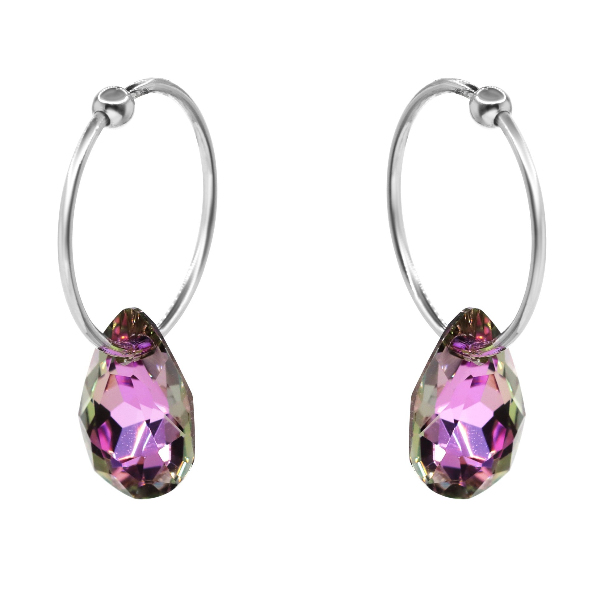 Aros de Plata 925 Argollas con Cristal Gota Tornasol Rosado.