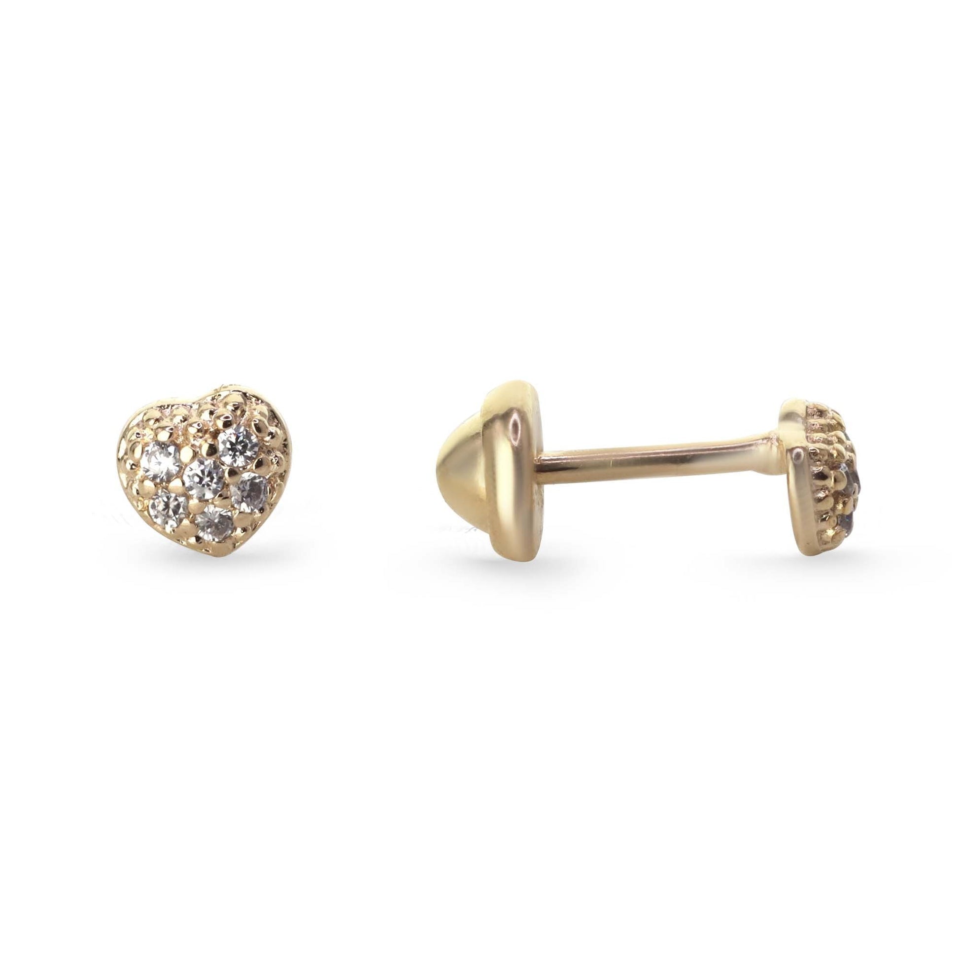 Enchapado en oro con diseño de corazón, circones y tope. Tierno, brillante y seguro para personas jóvenes.