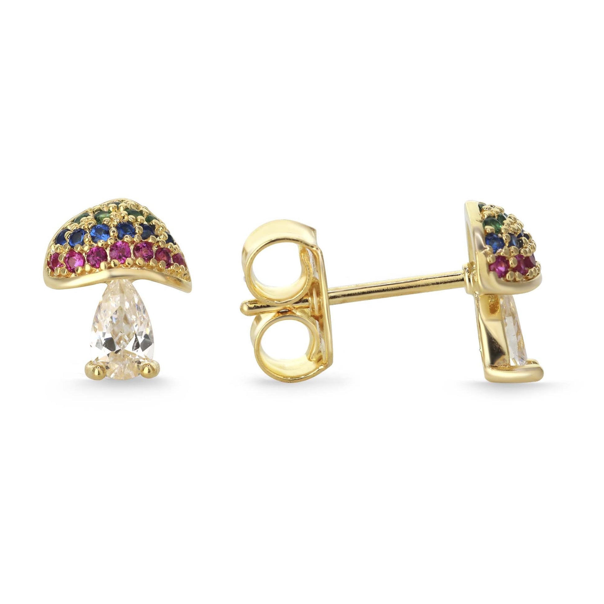 Aros Aros enchapados en oro con diseño tipo seta, decorados con circones de colores. Alegres, llamativos y con un estilo original que atrae miradas. Perfectos para quiénes buscan algo distinto y con personalidad.