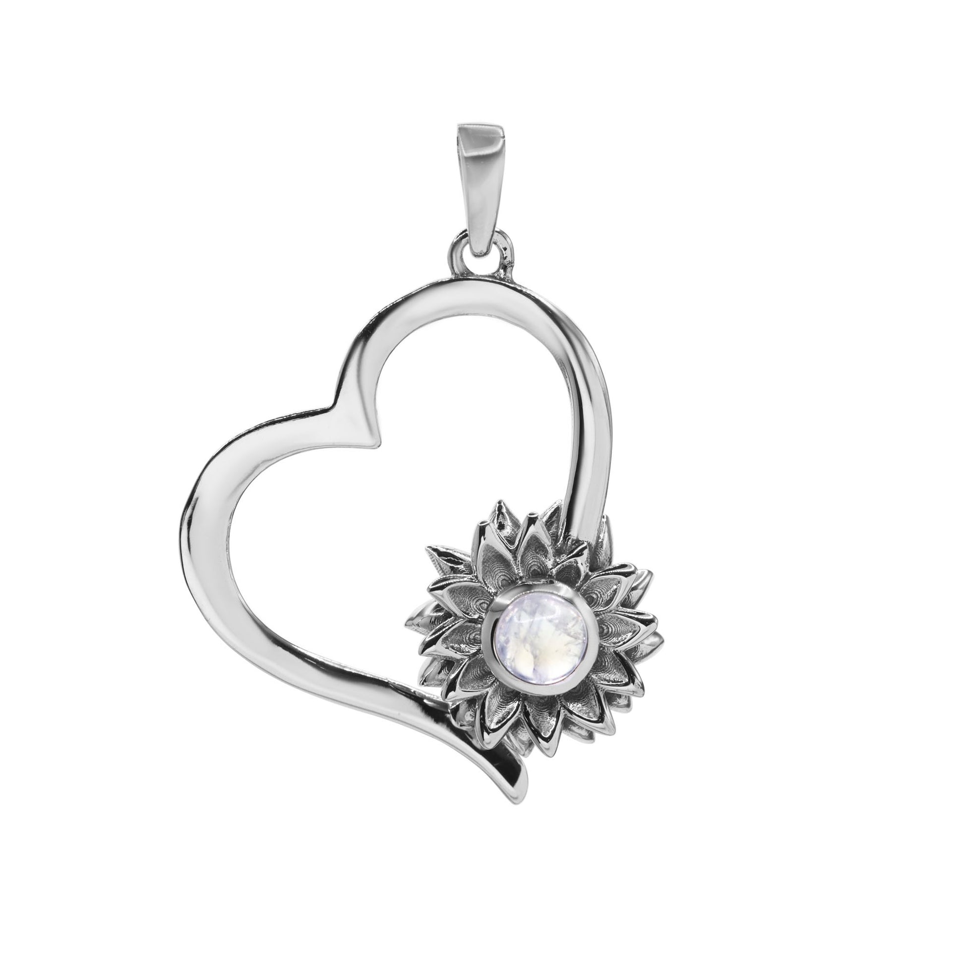 Colgante de Plata - Corazón con Flor de Girasol y Piedra Luna