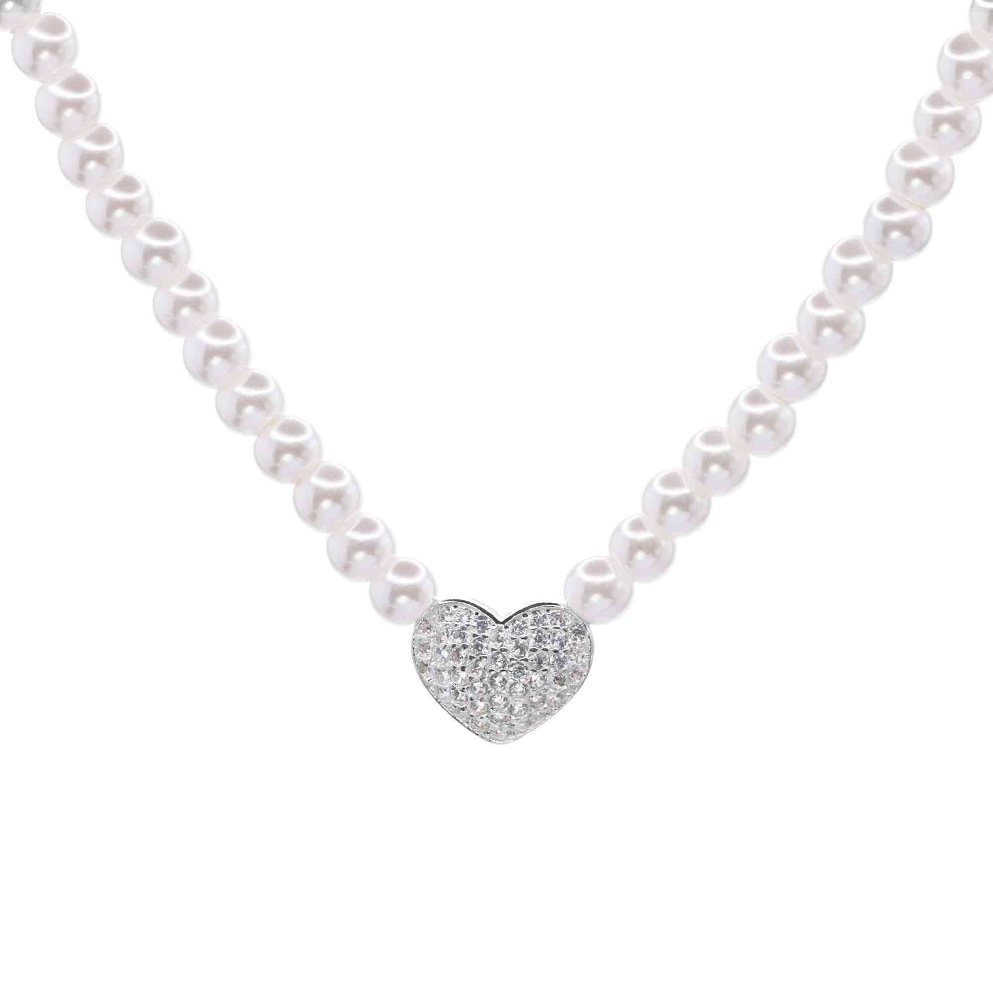Collar de Plata 925 Delicadas Perlas con Corazón de Circones - DJOYAS.