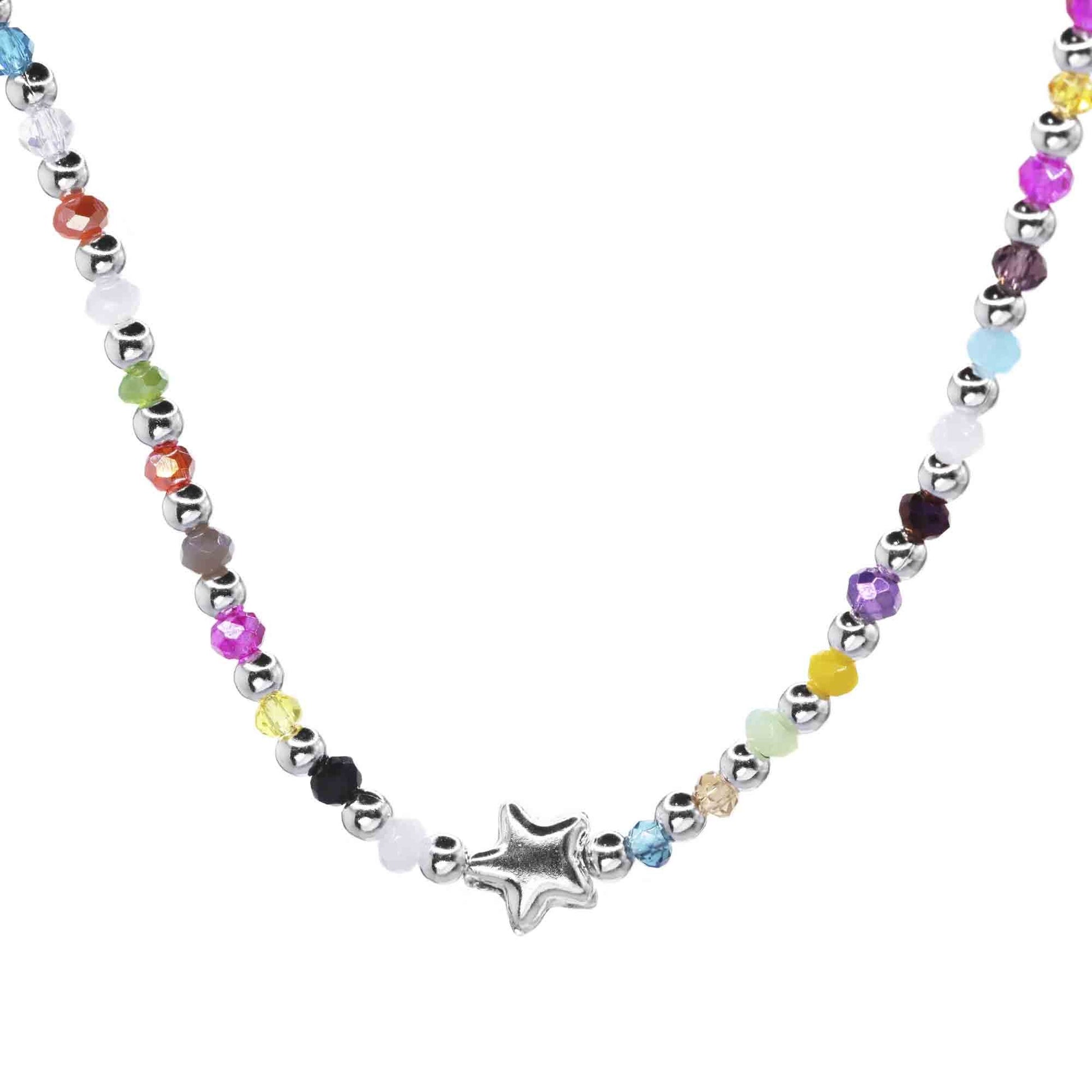 Collar de Plata Esferas Lisas con Piedras Ágata de Colores y Figura de Estrella