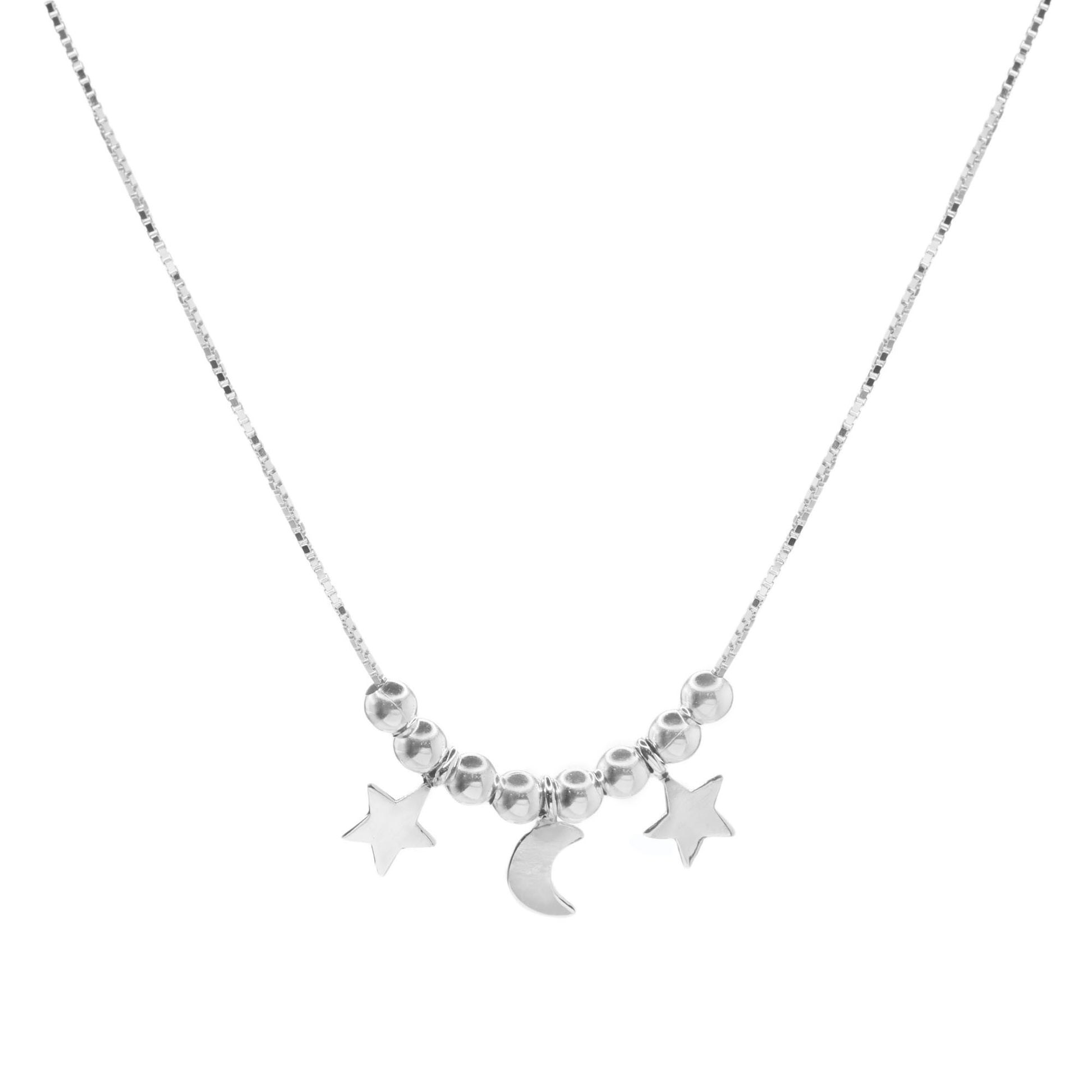 Collar de Plata 925 Estilo Esferas Lisas con Placas de Luna y Estrellas Lisas.