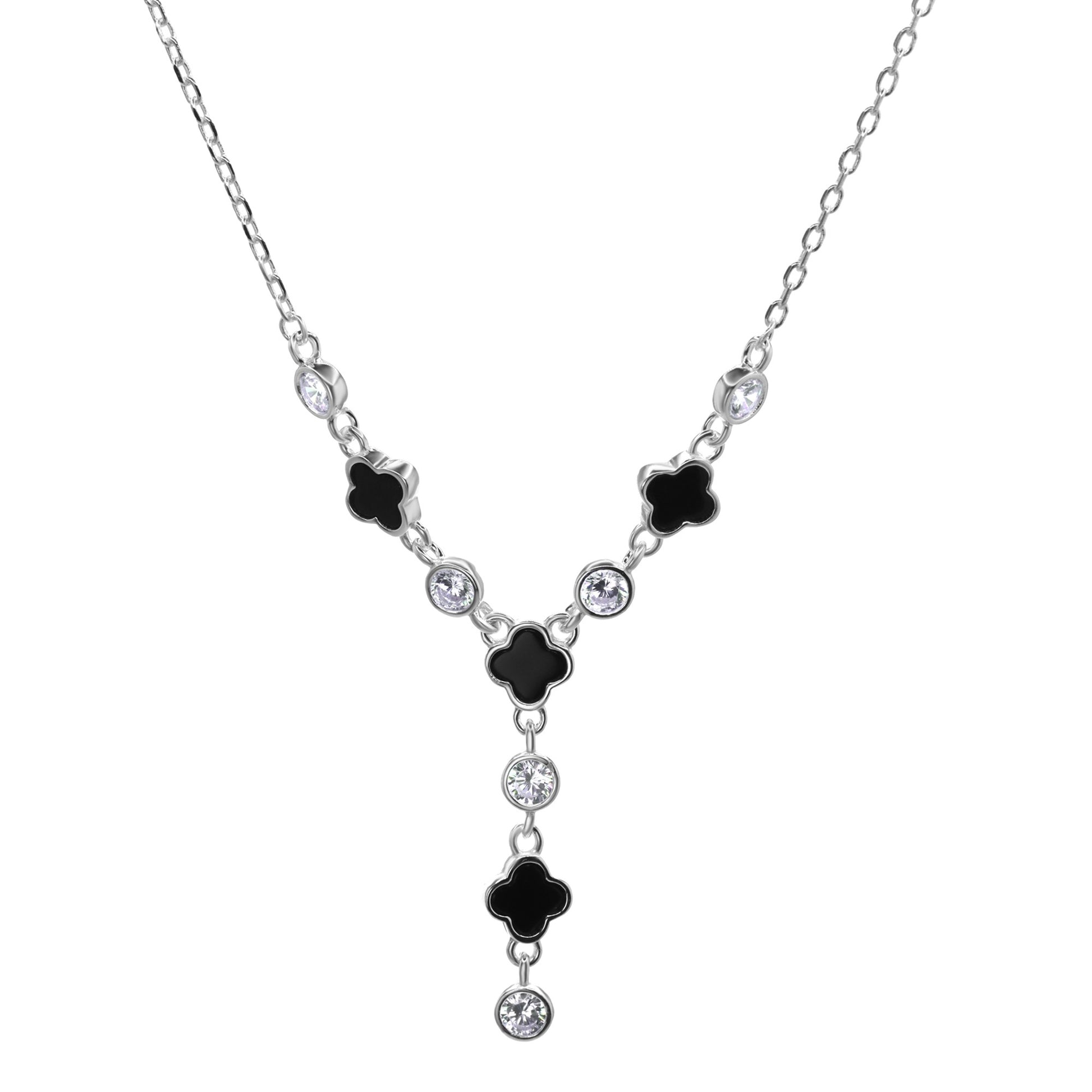 Collar de Plata 925 Modelo Y con Tréboles Negros y Circones. Peso 3,61 Gramos Aprox.