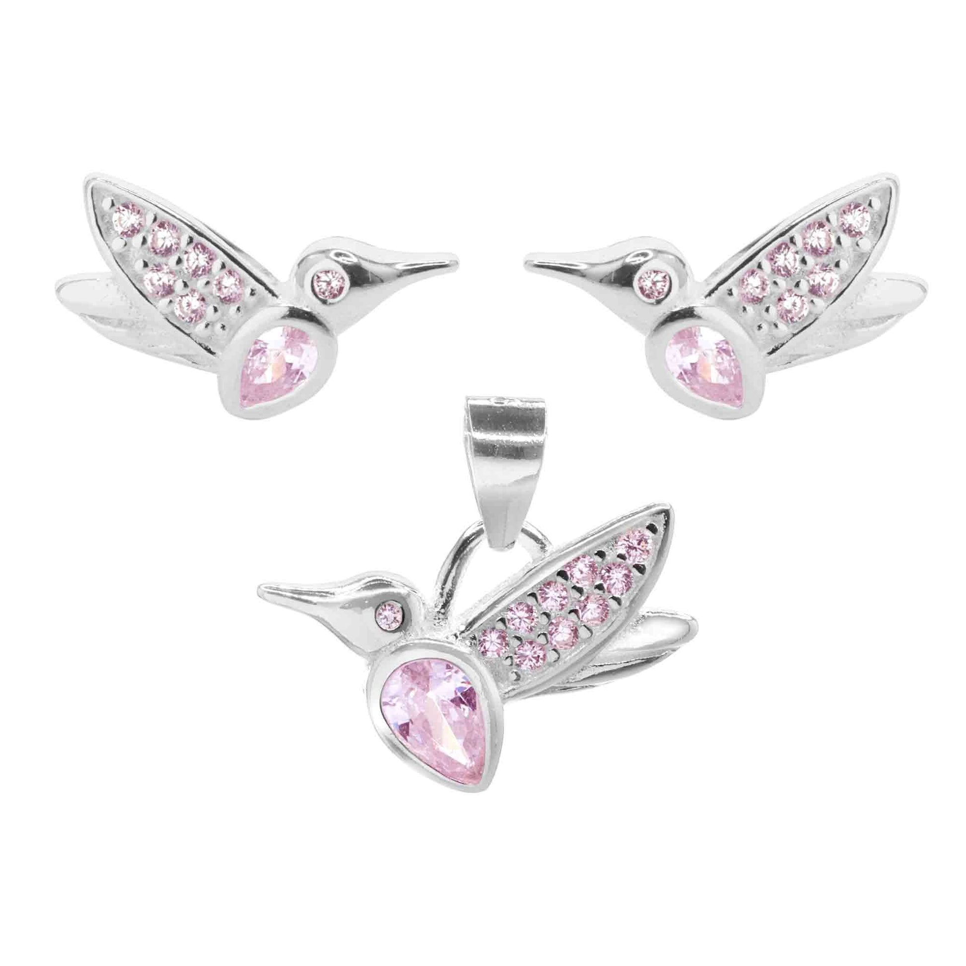 Conjunto de Plata Serie Colibríes con Circones Rosa
