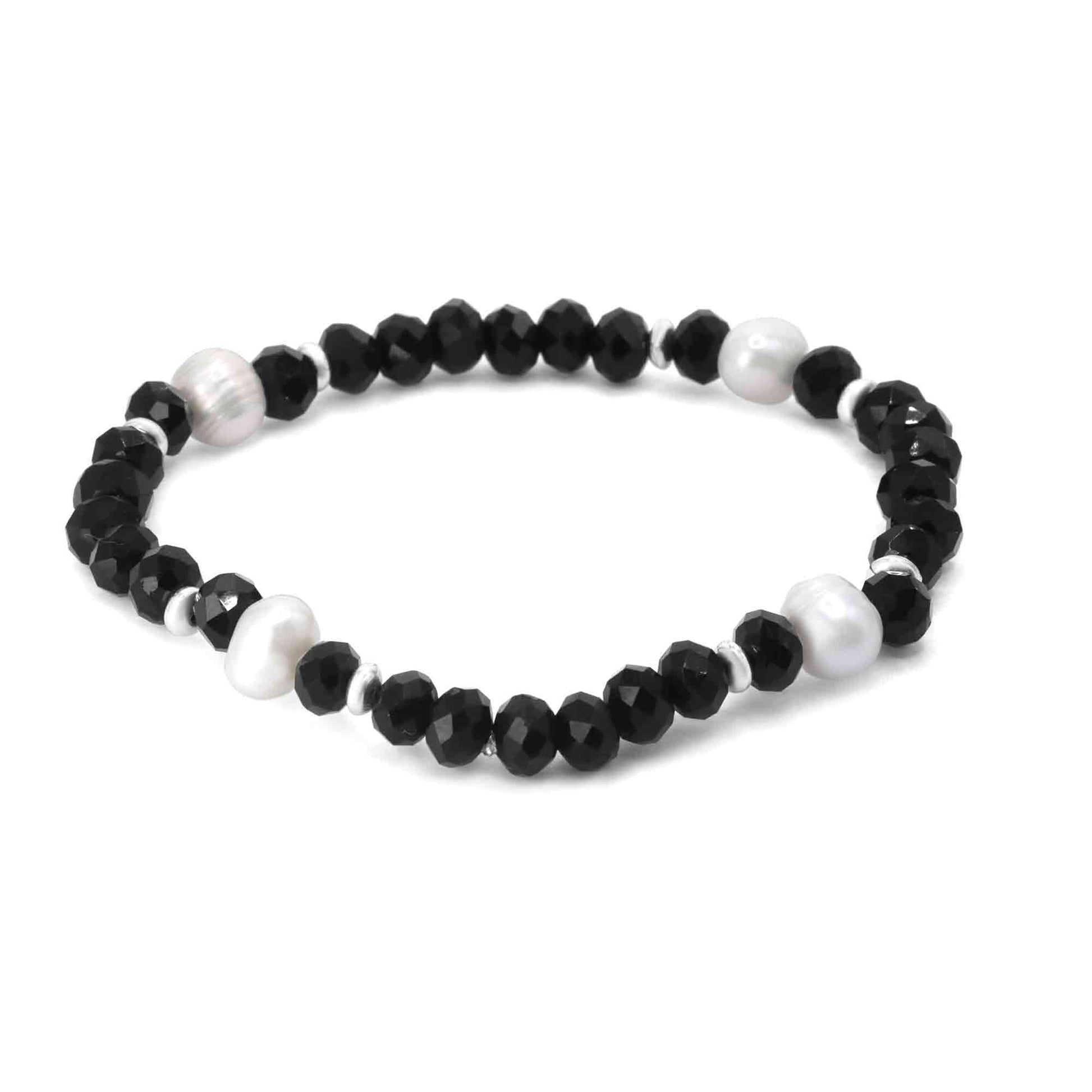 Pulsera Enchapada en Plata Cristales Negros con Perlas de Río. Elástico.